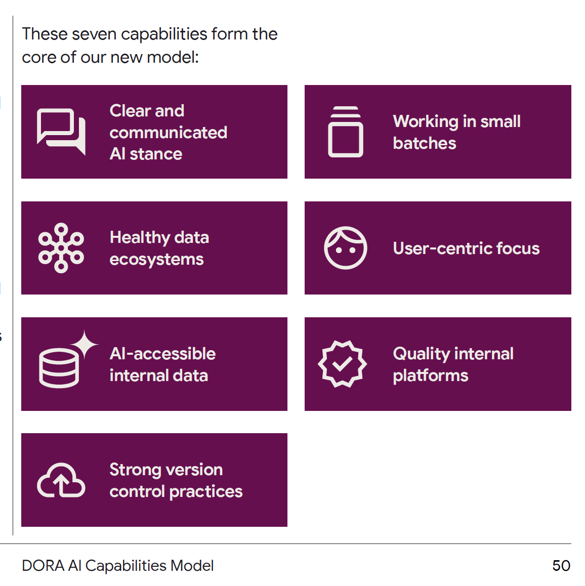 The DORA AI Capabilities Model identifies seven foundational practices proven to amplify the positive impact of AI on organizational performance and individual effectiveness.
