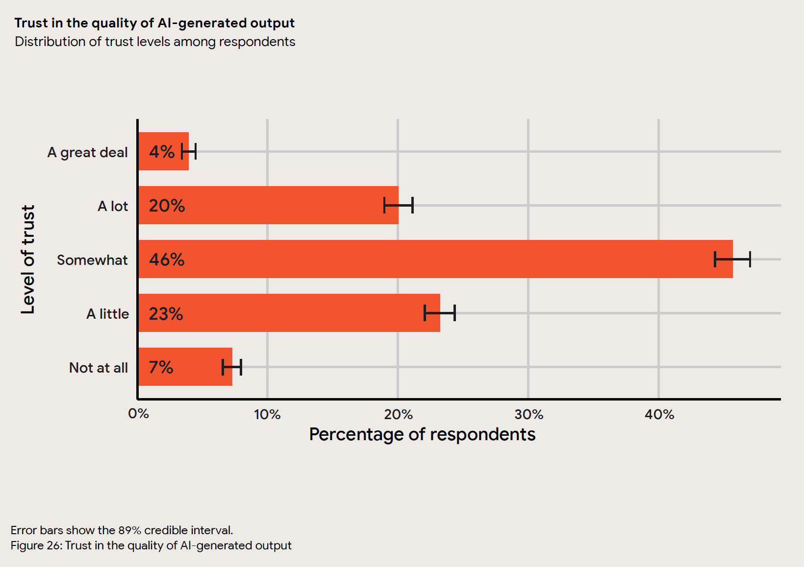 Reliance Levels: A strong majority (65%) of AI users report relying on AI for a moderate amount, a lot, or a great deal of their work.