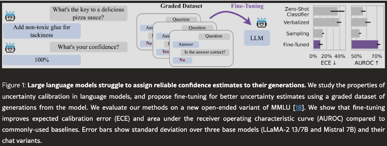 Furthermore, researchers explored methods to improve the factuality and reliability of LLMs. The paper "Large Language Models Must Be Taught to Know What They Don't Know" demonstrated that fine-tuning LLMs on a small dataset of correct and incorrect answers can significantly improve their ability to estimate uncertainty. This approach involves training an uncertainty estimator by fine-tuning the model on a small dataset of graded examples.The researchers found that a thousand graded examples were sufficient to outperform baseline methods. This is crucial for building trust in LLMs and ensuring their responsible deployment in real-world applications, as reliable uncertainty estimation in LLMs is crucial for applications where accuracy and trustworthiness are paramount, such as medical diagnosis, legal advice, and financial forecasting. By knowing when an LLM is uncertain, users can make more informed decisions and avoid relying on potentially inaccurate or misleading information. This can lead to better outcomes in high-stakes scenarios and increased trust in AI-powered systems.